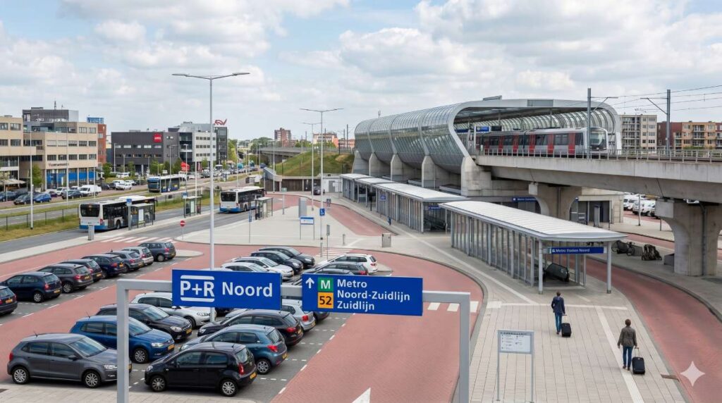 Der P+R Noord liegt strategisch perfekt für alle, die aus dem Norden (über die A7 oder A8) oder über den Amsterdamer Ring (A10) anreisen.