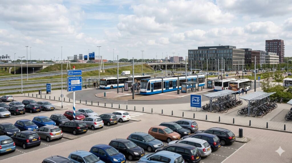 • Perfekte Anbindung: Direkt an der Autobahn A10 (Ring Amsterdam) gelegen, erreicht ihr die Parkplätze, ohne tief in die Stadt einfahren zu müssen.